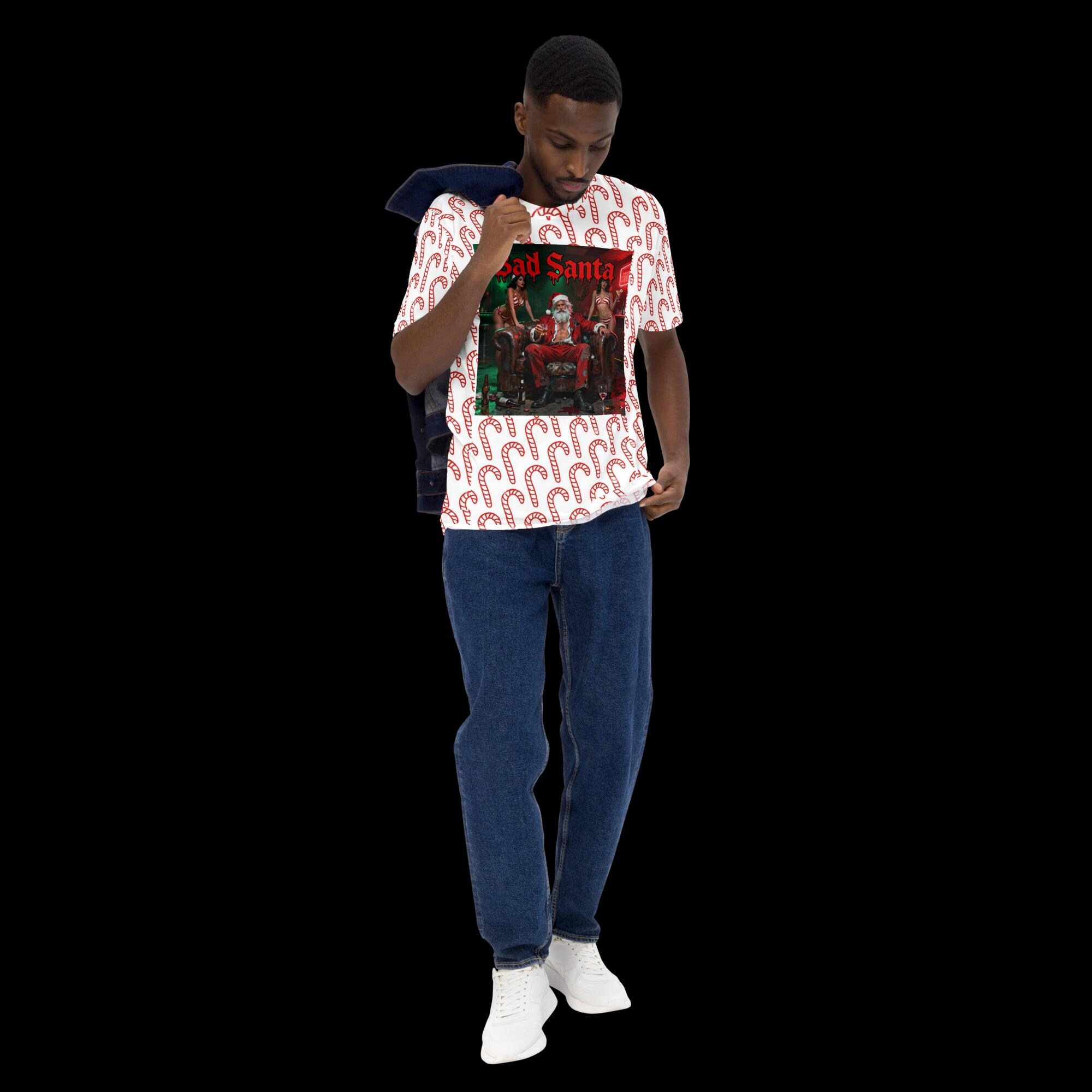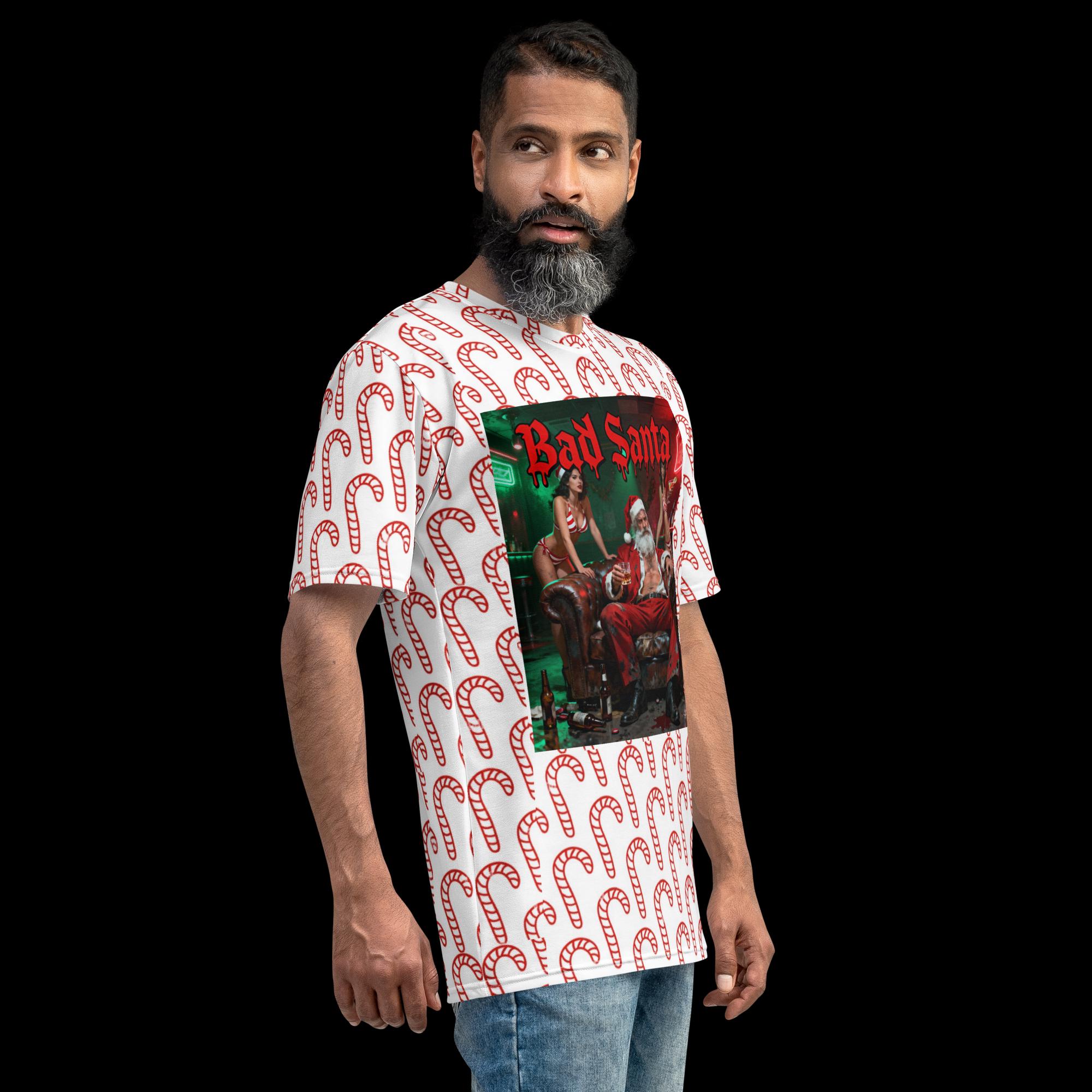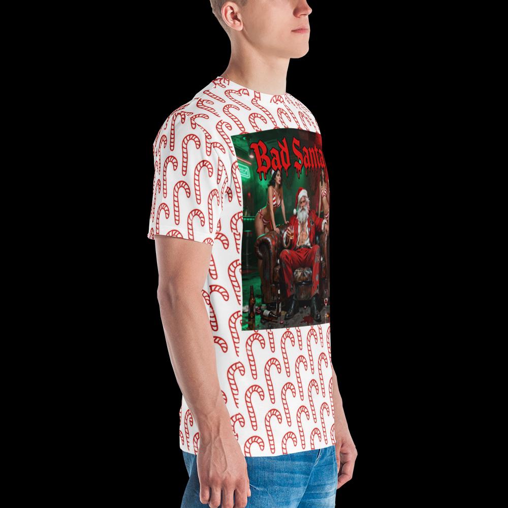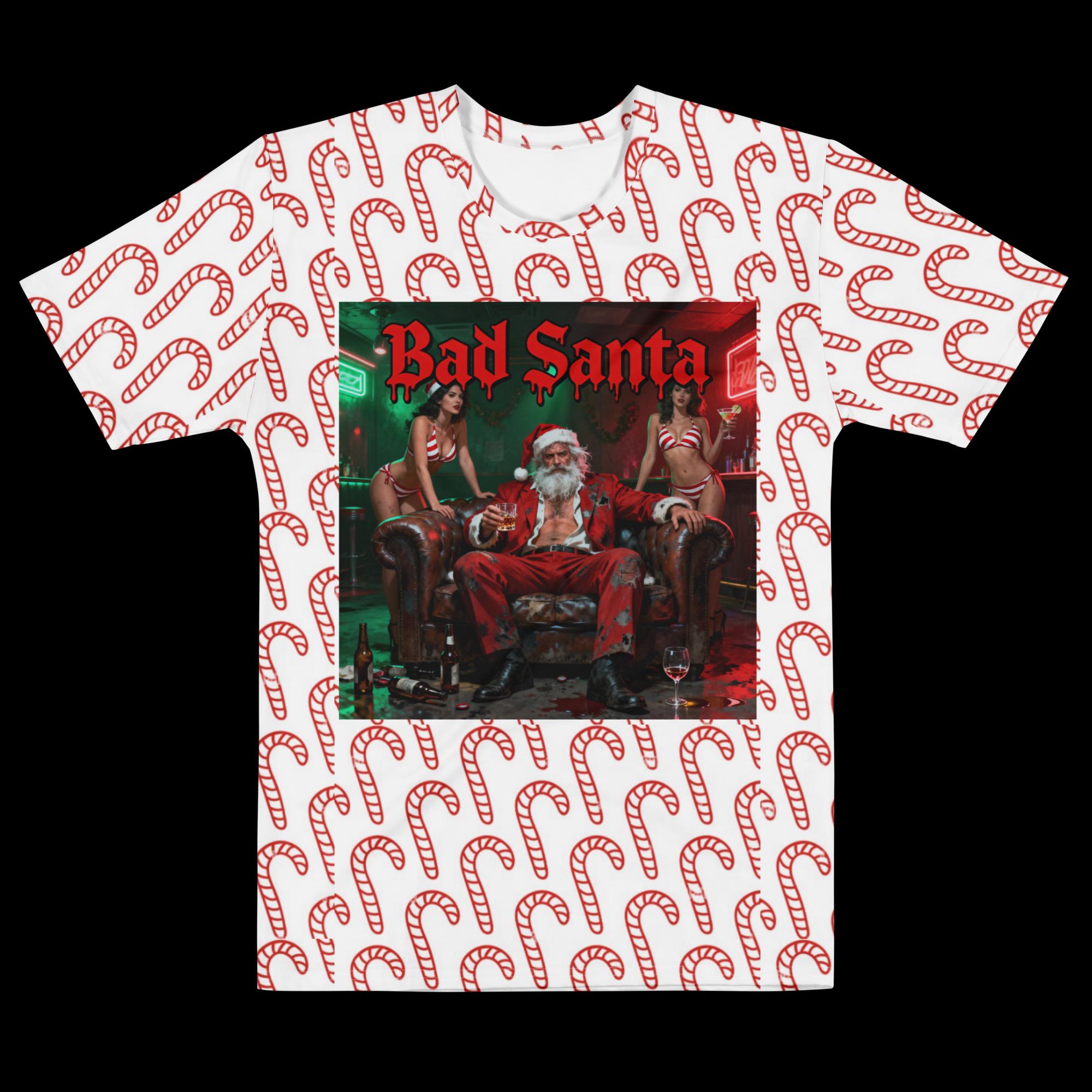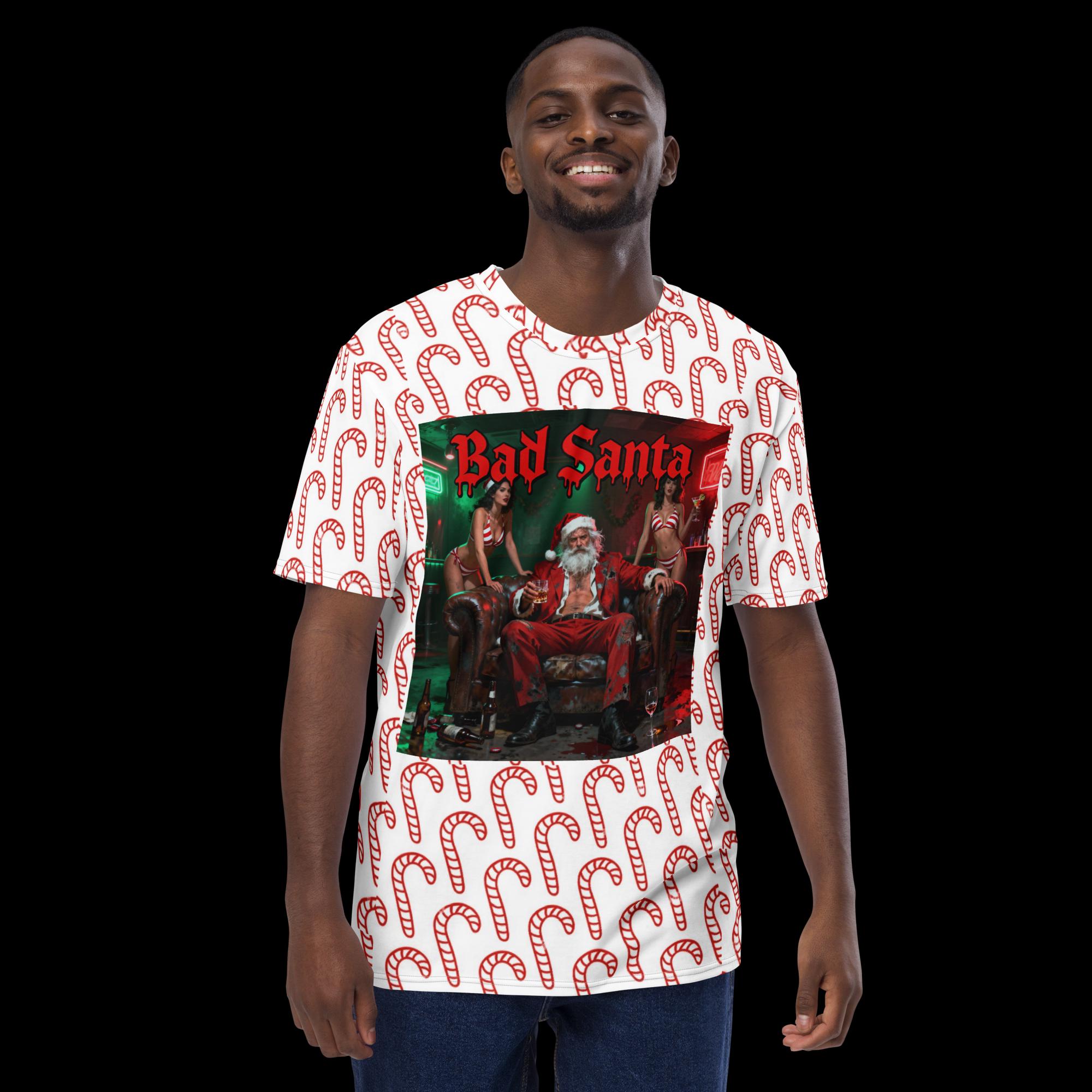 Celebrate the holiday season with a rebellious twist in our Bad Santa All-Over Print T-Shirt featuring a fun and festive candy cane pattern! This humorous Christmas holiday tee is perfect for men, women, and kids who love to add a bit of mischief and humor to their festive wardrobe. The bold, eye-catching design showcases a mischievous Santa lounging confidently, making it an ideal choice for holiday parties, family gatherings, or just spreading cheer in your own unique style.