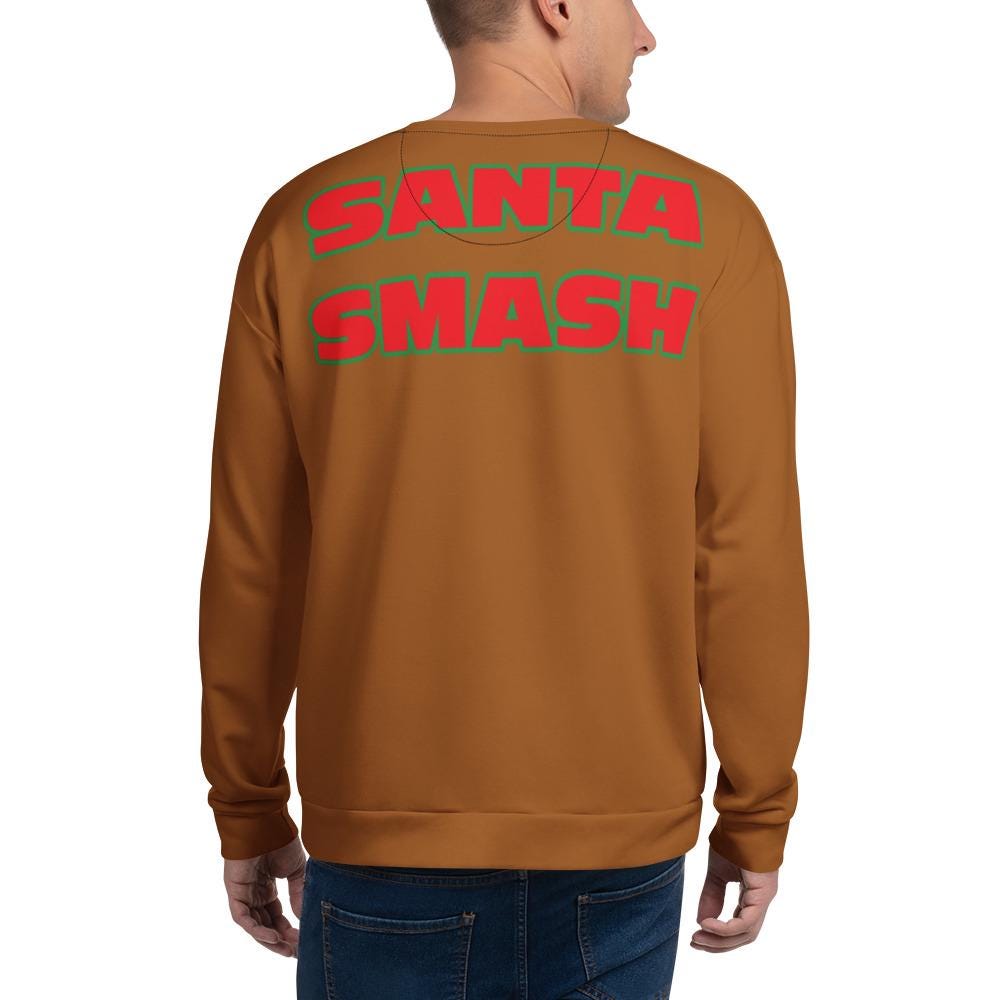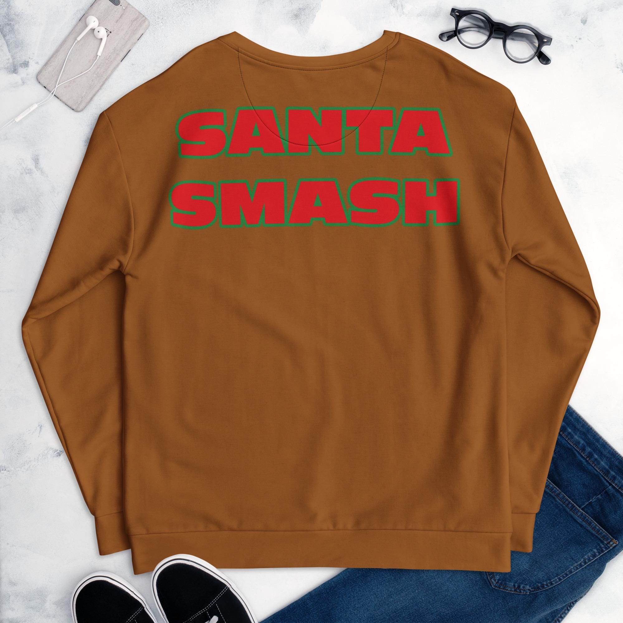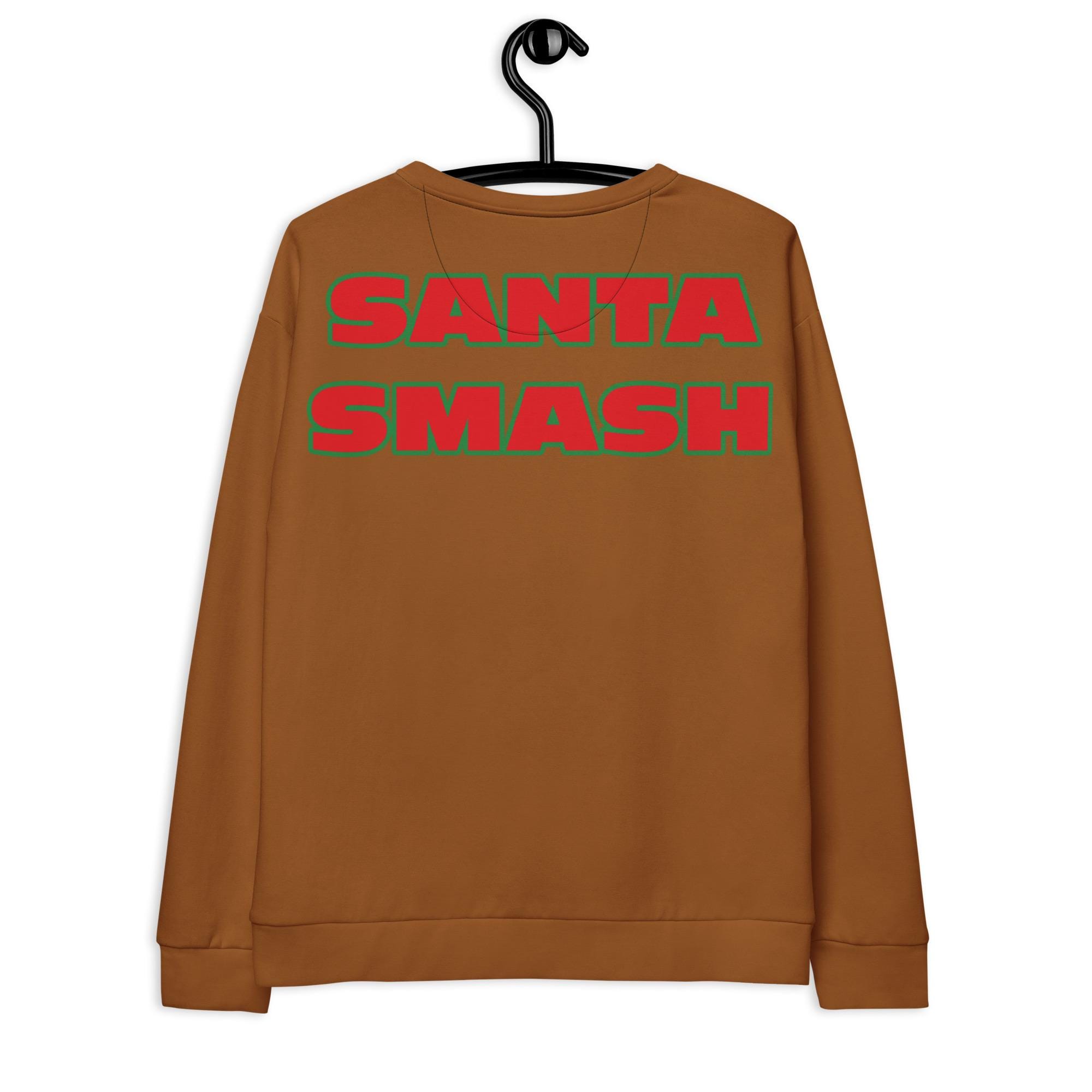 This design is ideal for Christmas parties, holiday events, ugly sweater parties, gag gifts, fitness lovers, gym fans, weightlifters, and anyone who enjoys humorous Santa artwork. The back features the bold phrase “Santa Smash,” making it a standout conversation starter.