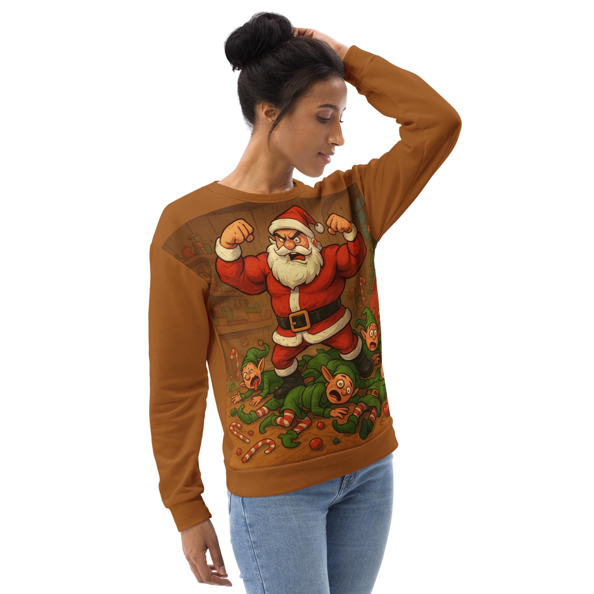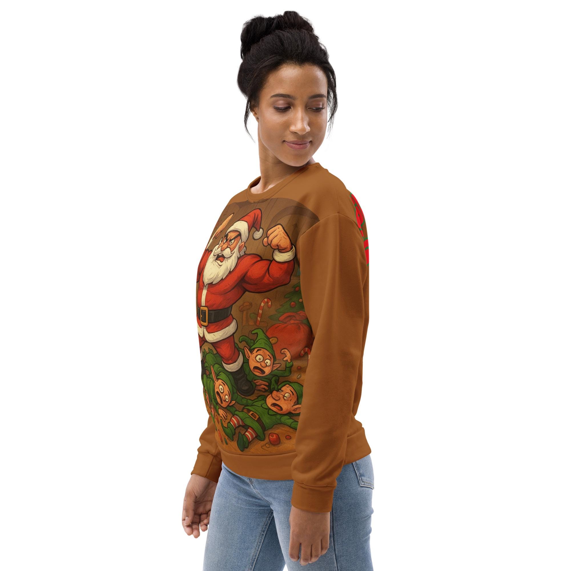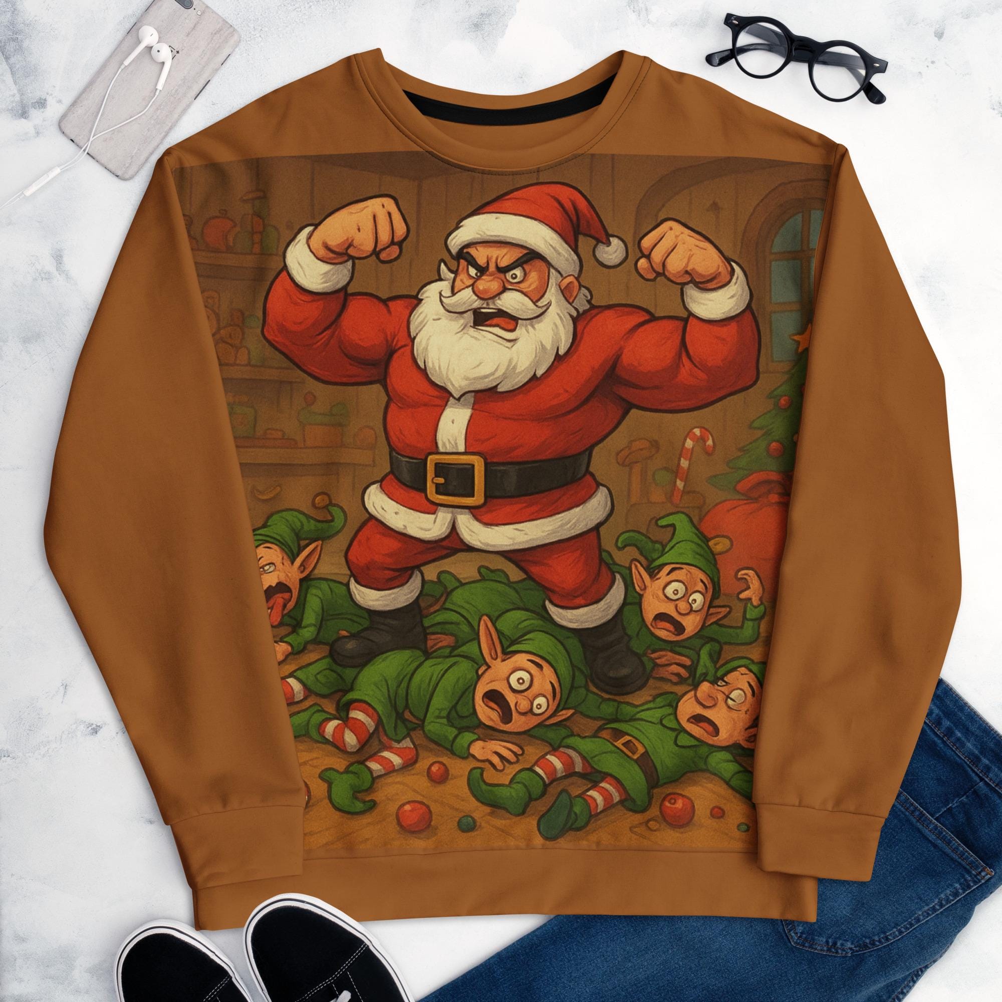 Bring some hilarious chaos to the holidays with this bold and funny “Santa Smash” Christmas design! The artwork features a muscle-bound, over-the-top Santa Claus flexing triumphantly after knocking over a group of stunned, goofy elves. With bright colors, cartoon-style characters, candy canes scattered on the floor, and Santa showing off his power, this design is perfect for anyone who loves funny Christmas shirts, holiday gym humor, Santa parody art, or festive cartoon tees.