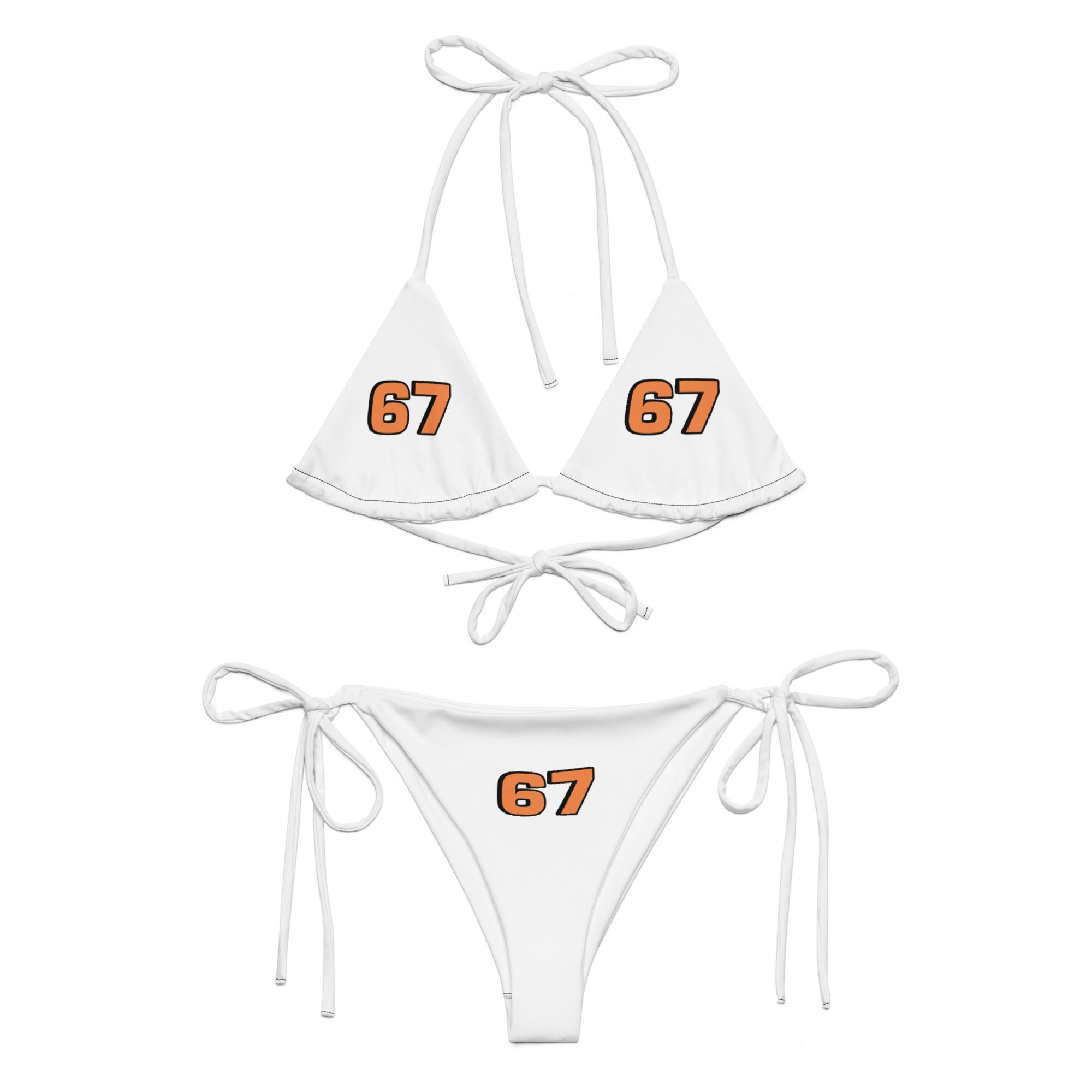 Made for sunny days and confident vibes, this 67 two-piece bikini is perfect for beach trips, poolside lounging, vacations, festivals, or summer photoshoots. The crisp white color paired with the bold orange 67 number design gives this bikini a modern, sporty edge while still feeling timeless and fun.