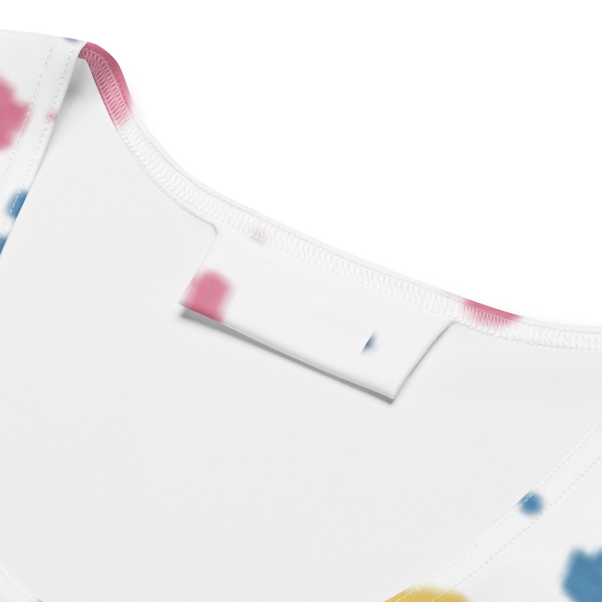 • 75% recycled polyester, 25% elastane for production in the US/Mexico • 82% polyester, 18% elastane for production in Latvia • Fabric weight: 6.64 oz./yd.² (225 g/m²) in the US/Mexico • Fabric weight: 6.78 oz./yd.² (230 g/m²) in Latvia • Four-way stretch, which means fabric stretches and recovers on the cross and lengthwise grains • Made with a smooth, comfortable microfiber yarn • Precision-cut and hand-sewn after printing • Blank product components sourced from Mexico and China