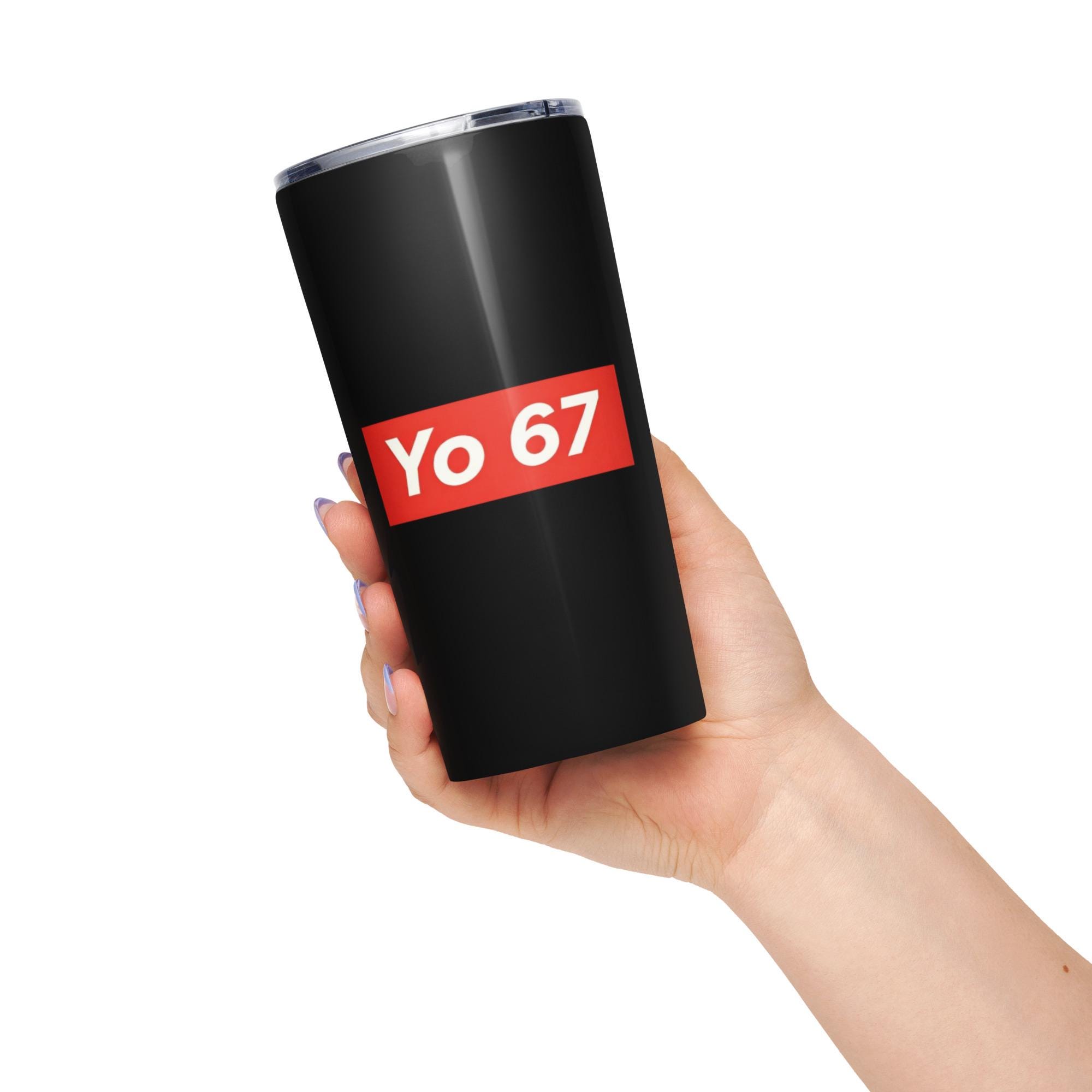Stay sippin’ in style. This 20-oz stainless steel tumbler keeps your drinks hot or cold on the go with a sleek, glossy finish and a spill-resistant lid. Perfect for daily commutes, workouts, or cozy mornings. YO 67 tumbler Stainless steel tumbler Funny statement cup Insulated travel mug Minimalist drinkware Reusable coffee tumbler Modern desk cup Bold graphic tumbler Everyday drink cup