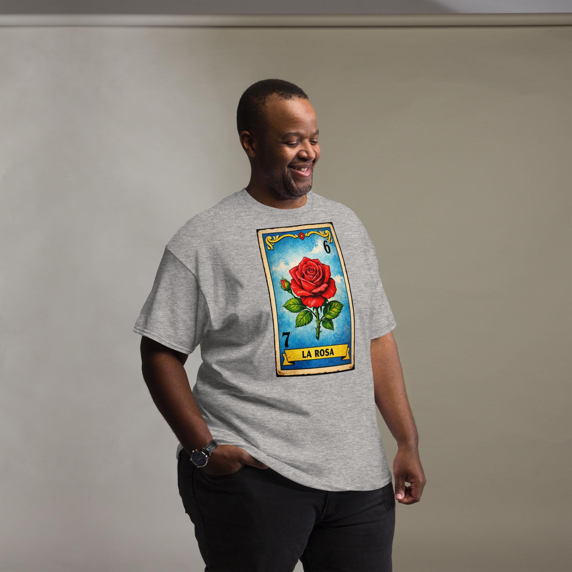 Let’s talk about this La Rosa unisex t-shirt—because honestly, it’s doing most of the talking for you. Inspired by vintage Lotería card artwork, this retro rose graphic tee is for people who appreciate art, irony, and looking effortlessly cool without trying too hard (because trying is exhausting).