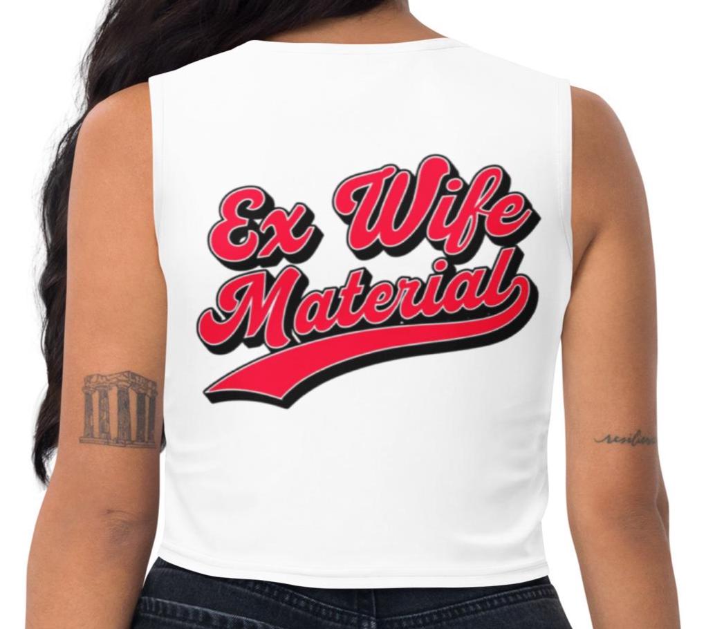 Make a statement without saying a word. This Ex Wife Material crop top is designed for women who embrace confidence, humor, and unapologetic self-expression. Featuring a bold, eye-catching graphic on a clean white background, this funny divorce shirt for women blends sass and style in a flattering, modern silhouette.
