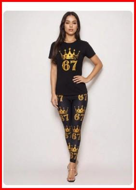 Key features include: - All-over crown and 67 graphic print for a bold, statement look - High-waisted fit for support and shaping - Soft, stretchy fabric for maximum comfort and flexibility - Perfect for yoga, fitness, gym wear, or casual athleisure
