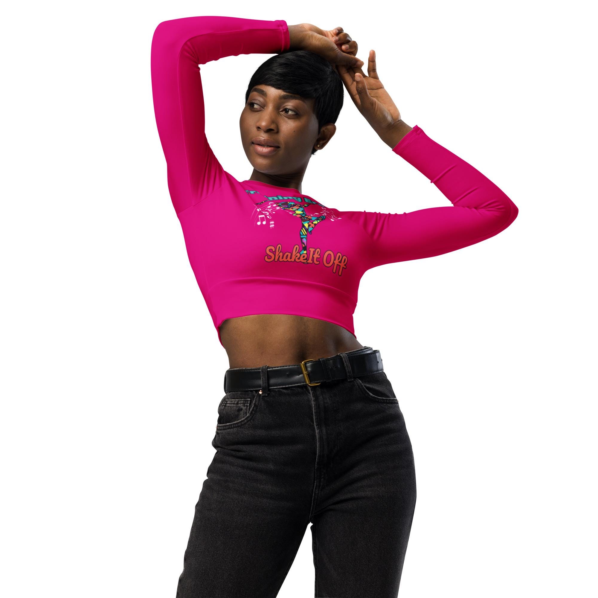 This long-sleeve crop top is made of recycled polyester and elastane, making it an eco-friendly choice for swimming, sports, or athleisure outfits. The crop top has a tear-away care label and a wide, double-layered waistline band for a comfortable fit.