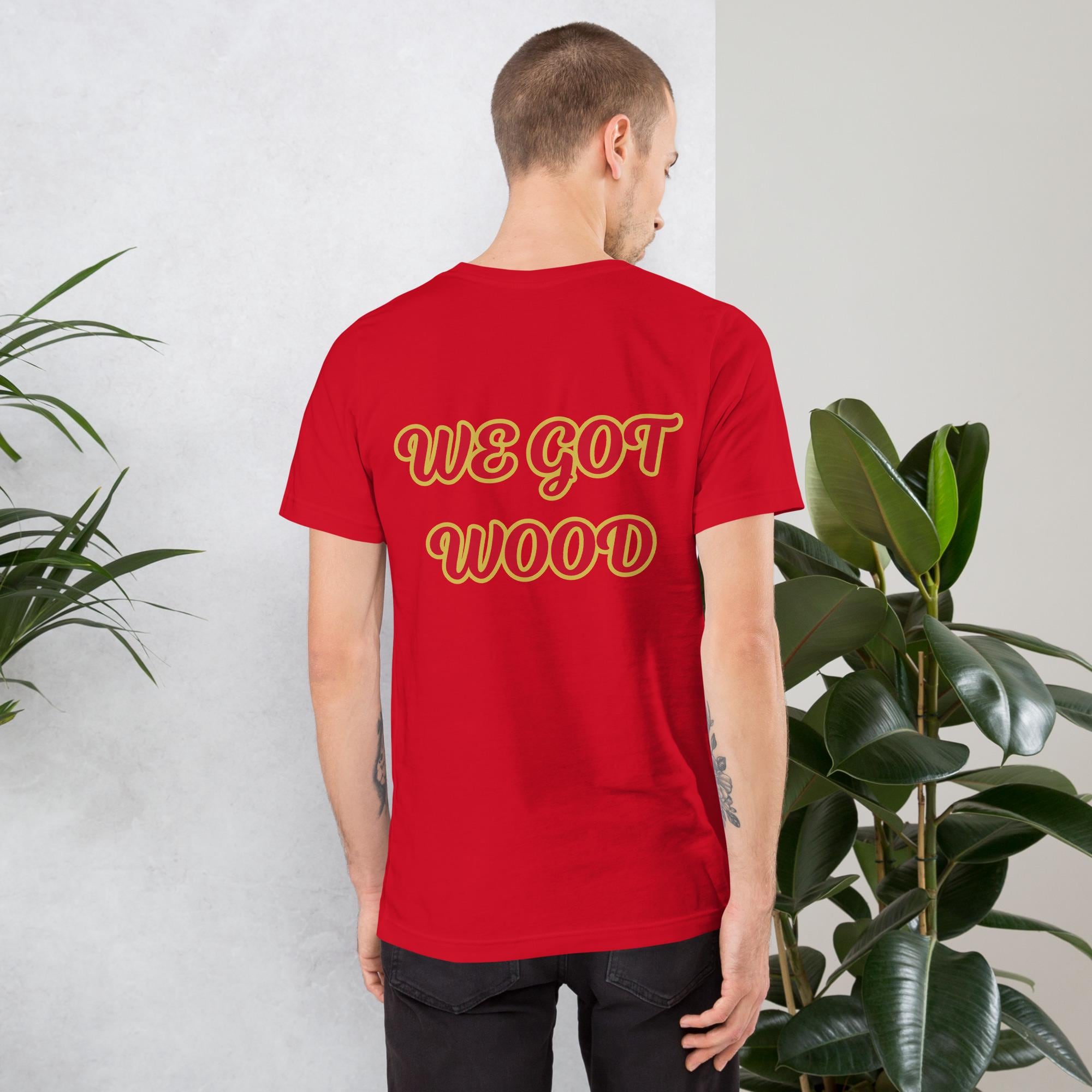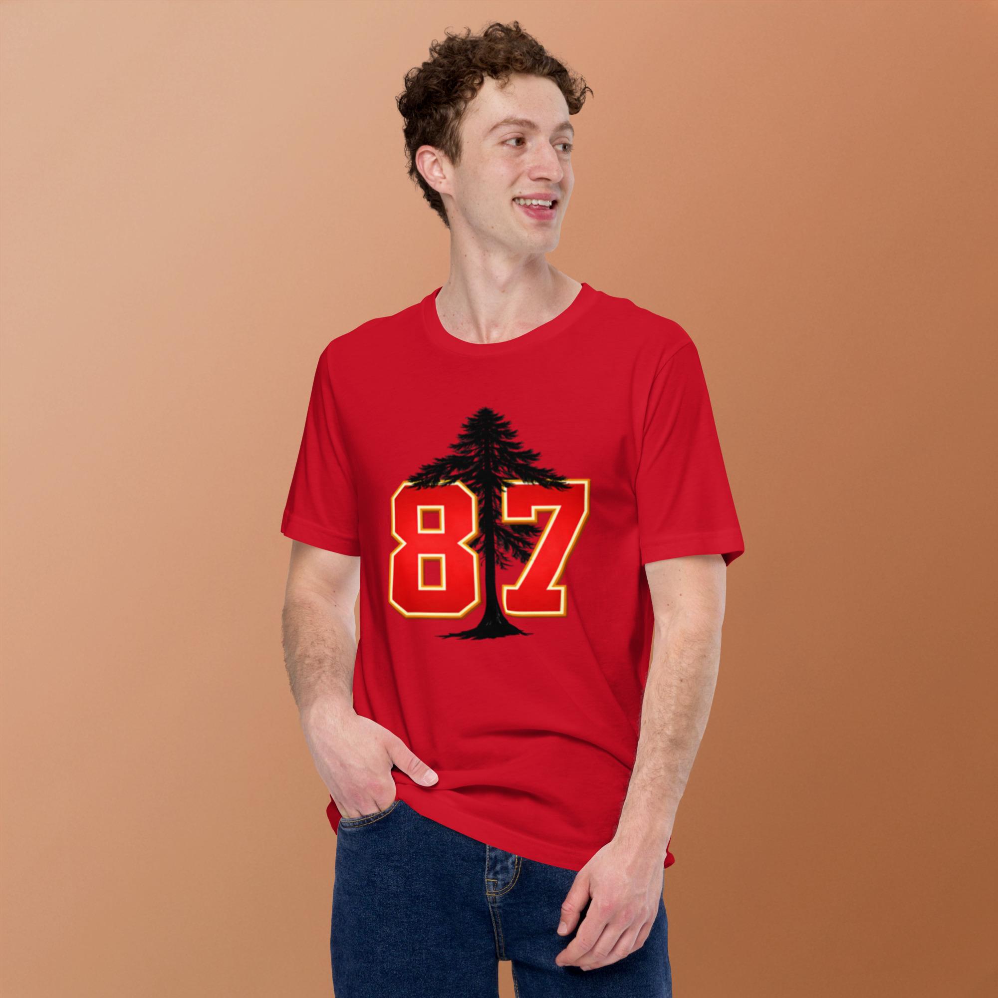 At the center is a powerful evergreen tree, symbolizing endurance, loyalty, and legacy — rising through the iconic 87 in classic football styling. The red and gold palette nods to game-day tradition, while the clean, bold layout keeps it masculine, wearable, and confident.