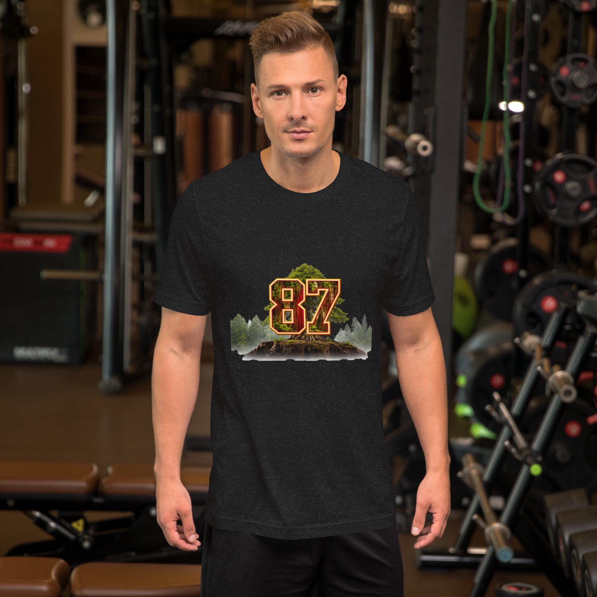 At the center is a powerful evergreen tree, symbolizing endurance, loyalty, and legacy — rising through the iconic 87 in classic football styling. The red and gold palette nods to game-day tradition, while the clean, bold layout keeps it masculine, wearable, and confident.