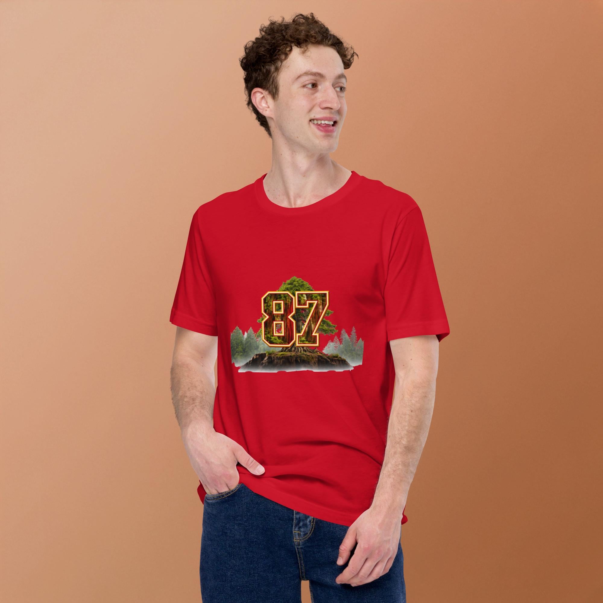 Travis Kelce inspired shirt, masculine Swiftie apparel, football Swiftie shirt, era inspired fan shirt, 87 football shirt, unisex Swiftie tee, red and gold football shirt, subtle Swiftie merch, men Swiftie shirt