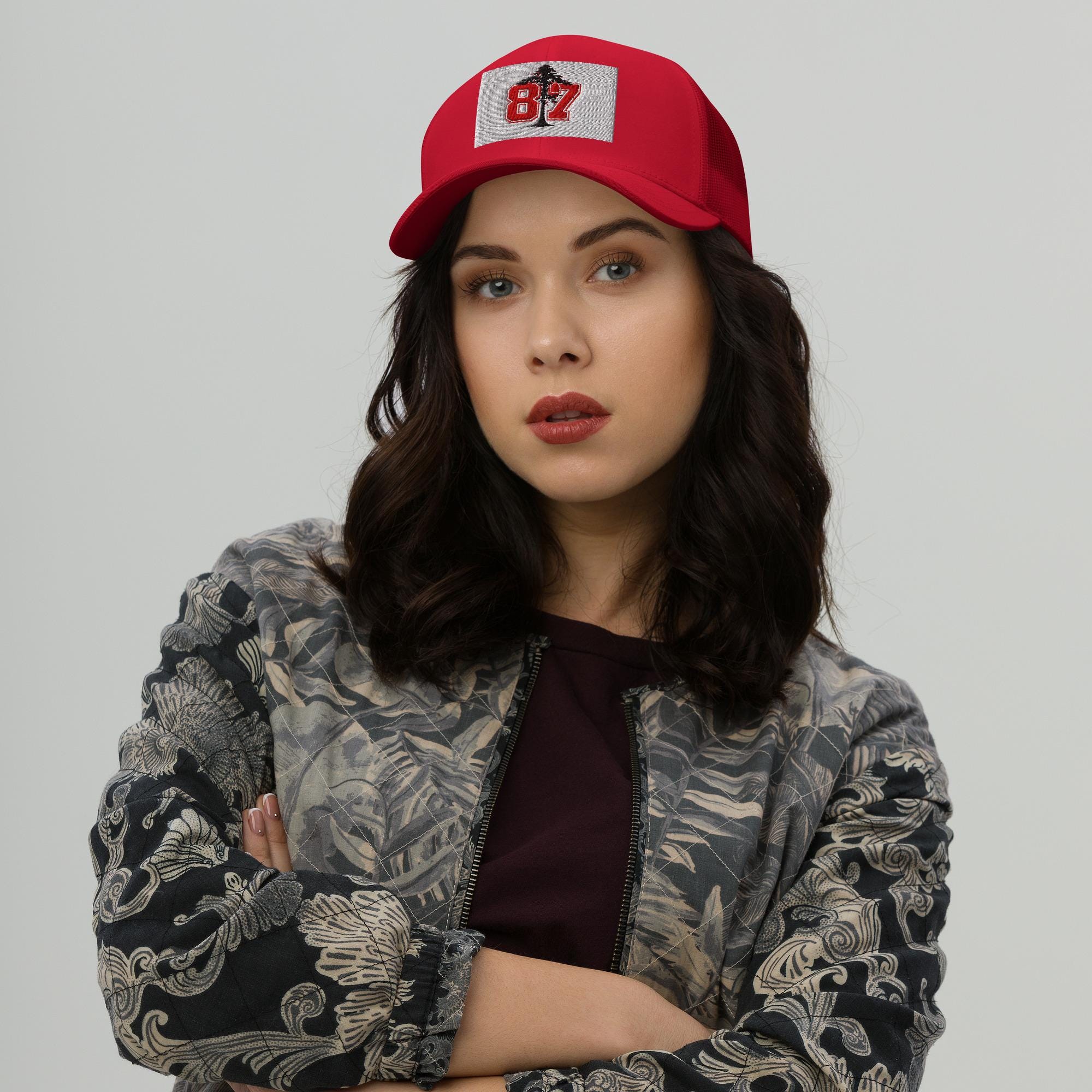 This 87 Redwood Football TRUCKER CAP is designed for fans who love the crossover moment — football meets pop culture — without the glitter, pastel, or “cute” aesthetic. Inspired by Travis Kelce’s iconic number 87 and the symbolism Swifties love, this design blends strength, roots, and timeless energy into one bold graphic.